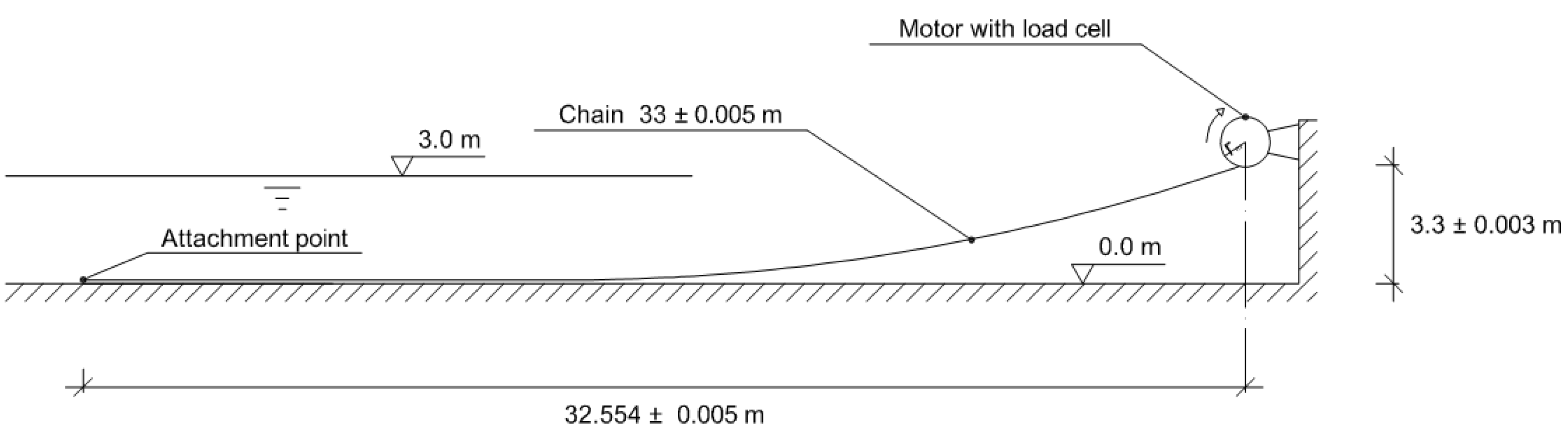 The model chain was suspended so that it partly rested on the concrete floor of the basin and was fixed to a lead weight at the far end. The configuration is shown in Figure 3. The upper end was attached to a rotating sheave with its centre 0.3 m above the water surface. This implies that the submerged length of chain varies somewhat during an excitation period.
