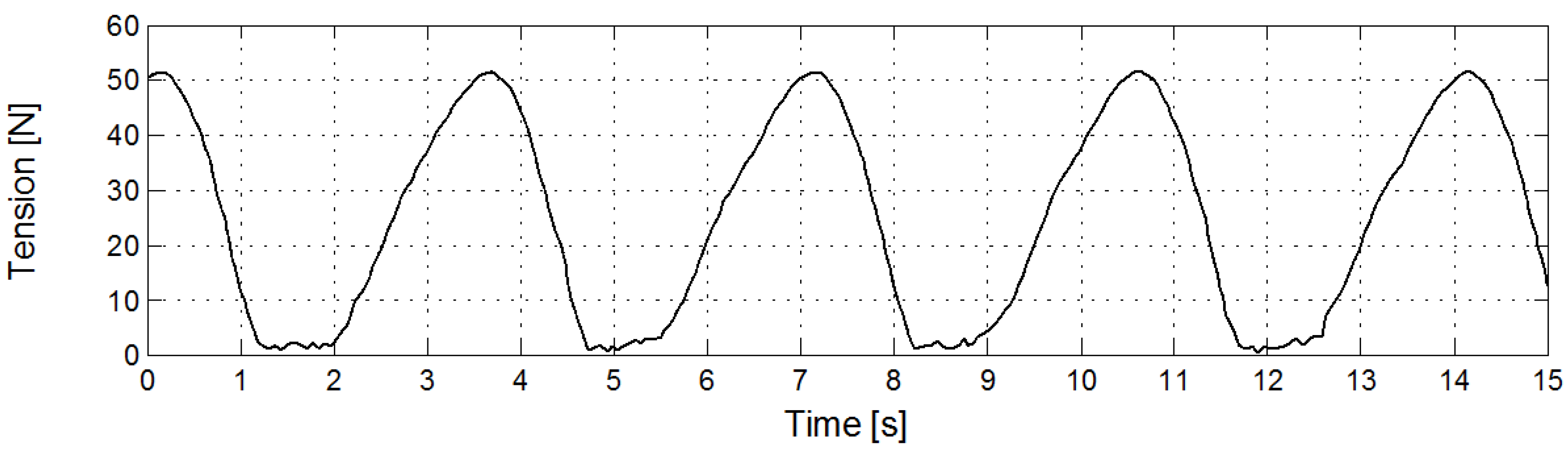 Two examples of recorded upper end force are shown in Figure 5 and Figure 6, from one long period test with Tm = 3.50 s, and one shorter period test with Tm = 1.25 s. In Figure 5 the tension response is slightly asymmetric, with a mild slope during the up-stroke and a sharper drop in the down-stroke. During approximately 1 s of the cycle the cable has virtually no stiffness as the major part is slack. When tension is regained, the response is still smooth because of the relatively long period oscillation. The same effects can be seen for the tension force record of the shorter period time in Figure 6, but here the re-tensioned cable gives rise to clearly visible transients in the tension force. This results in both a double peak appearance and a step-like behaviour of the tension force history during the upstroke motion.