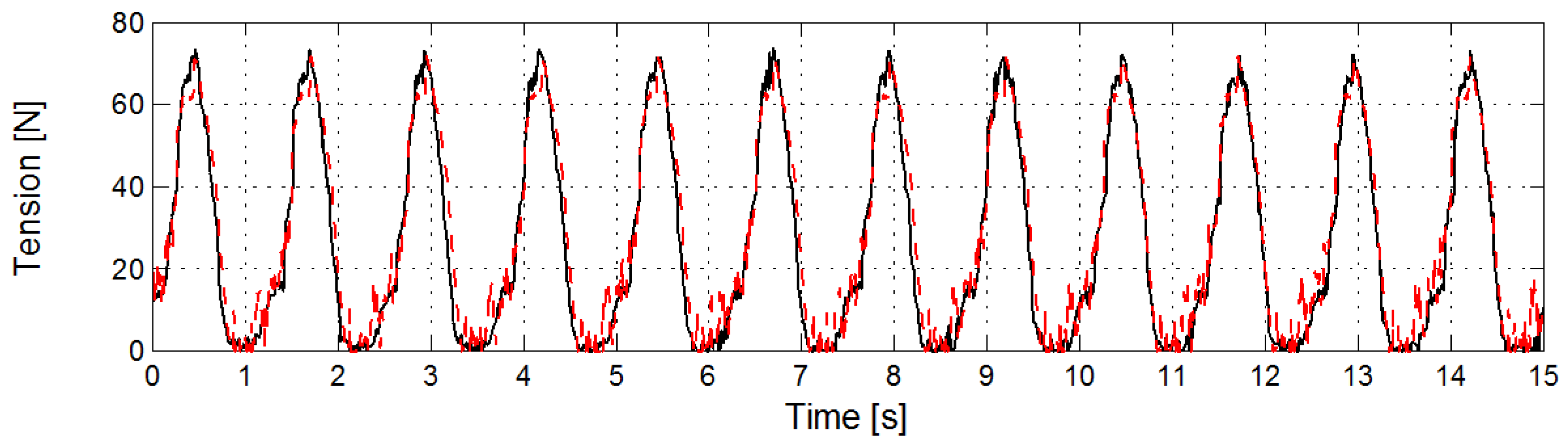 Recorded (solid black) and simulated (dashed red) upper-end force Fm (N) for the period Tm =1.25 s and radius rm = 0.2 m.