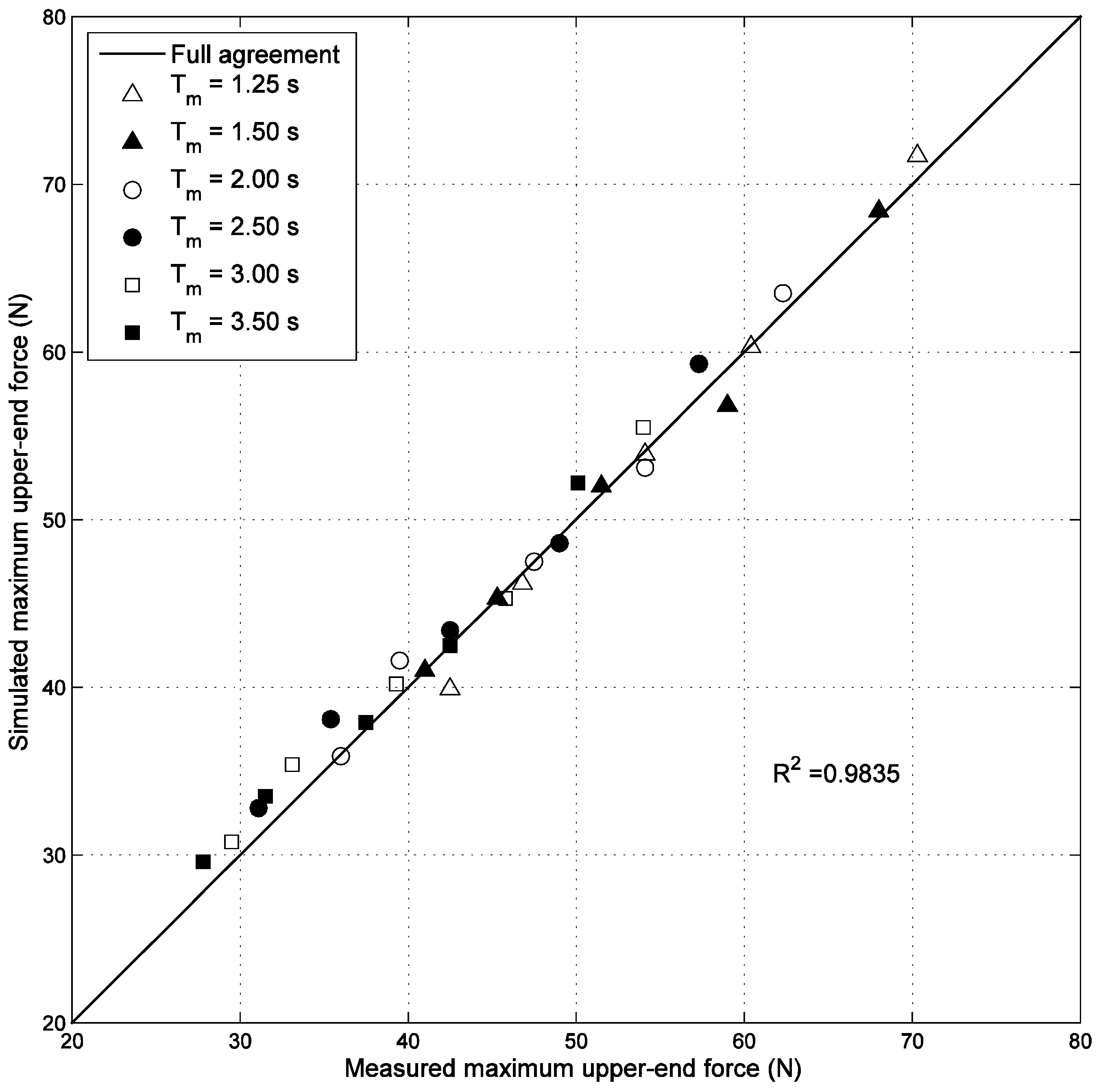 In Figure 9 the simulated maximum upper-end tensions of all combinations of (rm, Tm) are plotted as a function of measured maximum tension. The agreement is shown to be very good, with a correlation coefficient of R2 = 0.98 compared to full agreement.