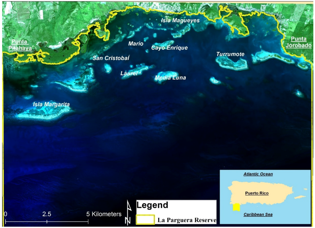La Parguera Natural Reserve is a marine protected area located in the southwest coast of Puerto Rico and it extends from the coast to the shelf edge with an area of approximate 168 square kilometers (Figure 1). The area of La Parguera is recognized for the exceptional value of its marine resources, which includes extensive coral reef ecosystems, seagrass beds, coastal mangrove fringe and mangrove islands, and two bioluminescent bays [18]. The shelf is also characterized by an irregular and complex physiography, with submerged patch reefs extending from 1 to 9 m off the bottom, an emergent reef with a characteristic reef crest, and a well-developed coral reef formation at the shelf edge [19]. The lack of significant rainfall and large rivers in the southwest coast, combined with the oligotrophic waters of the northern Caribbean contribute to the high levels of water transparency of the insular shelf and results in an optimization of growth rates and depth extent of coral reefs and seagrass beds [19]. The average annual rainfall at the Isla Magueyes Station in La Parguera is 74.52 cm. The average water depth is 18–20 m in the outer and middle shelf, while the shallow inner reef lagoon is less than 6 m deep.