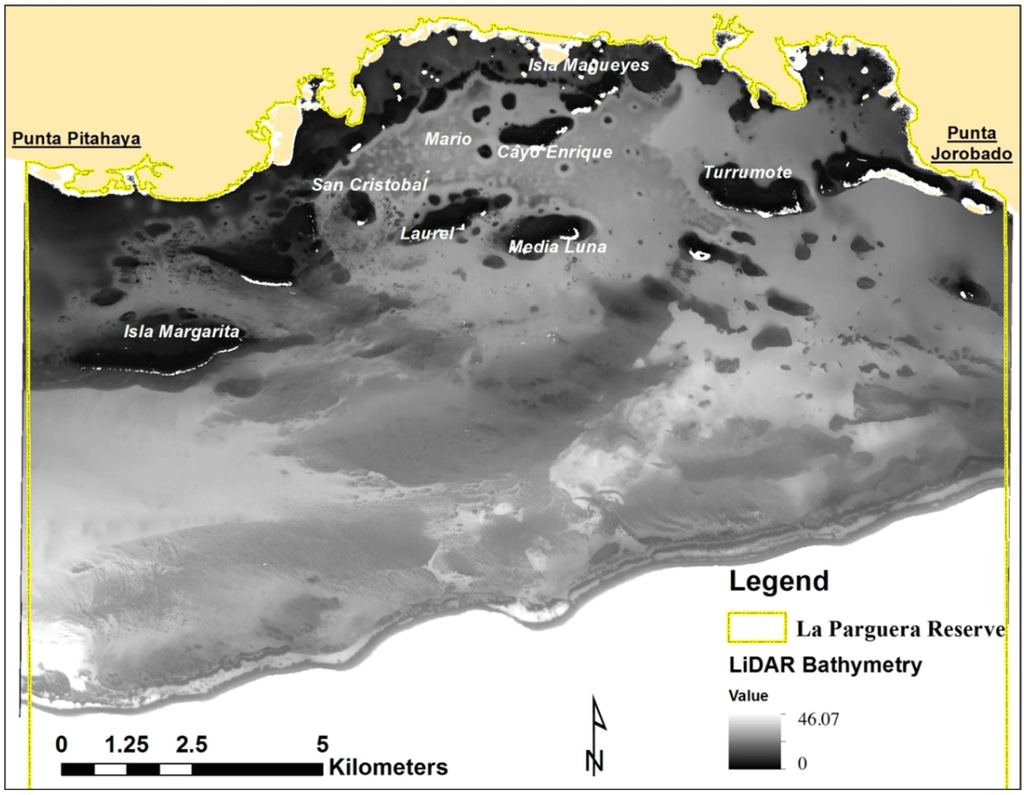 LiDAR topographic and bathymetric data were acquired over La Parguera Reserve region between April and May 2006 (Figure 2) for coastal elevations of 50 m above sea level to 70 m water depths using a Laser Airborne Depth Sounder (LADS) Mk II Airborne System [21]. This airborne system uses a 900 Hz Nd: YAG (neodymium-doped yttrium aluminum garnet) laser, which is split by an optical coupler into an infrared (1064 nm) beam and a green (532 nm) beam. The final product (16-bit Geotiff image) produced a 4 × 4 m bathymetry surface where the soundings were positioned relative to the NAD83 UTM 19 N horizontal coordinate system and to the Mean Lower Low Water (MLLW) vertical tidal coordinate system [22]. According to Costa [15], the horizontal accuracy of the dataset is better than ±5 m, and the vertical accuracy or maximum total vertical uncertainty (TVU) of the dataset is better than ±0.82 m.