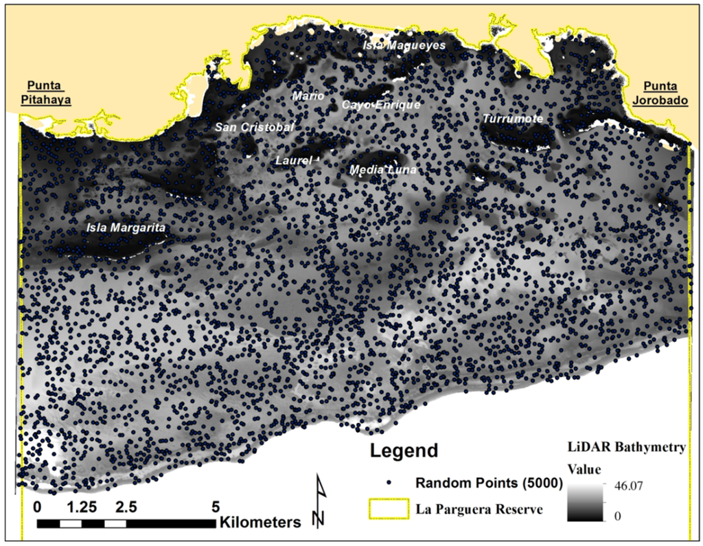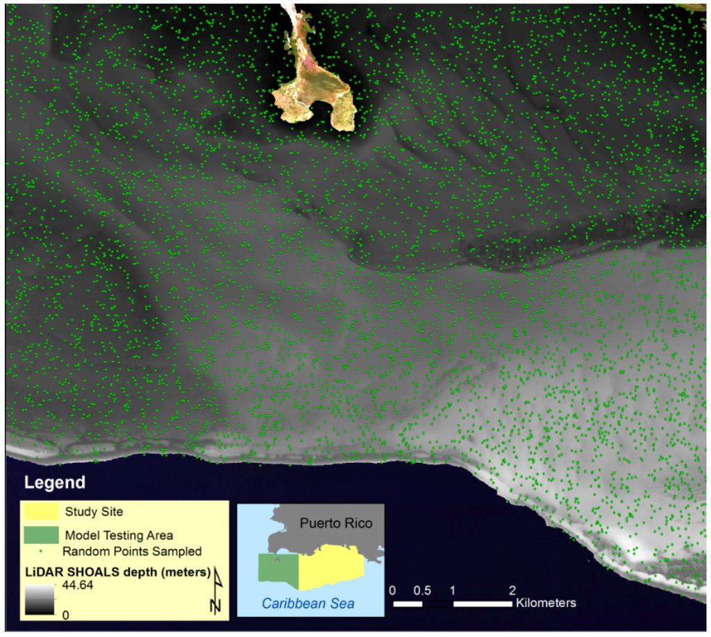 To establish a relationship between bottom depth from WV2 band ratios and depth from LiDAR SHOALS bathymetry, a random sample was used to extract the values from both images. This random sample consisted of 5000 points and accounted for all bottom types and depths across the images. These random points were constrained to the La Parguera Reserve Boundary and used as ground-truth data for the calibration (Figure 3).