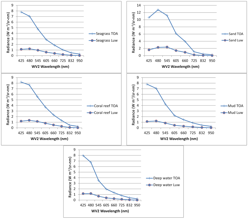Comparison of top of atmosphere (TOA) and water leaving radiances (Luw) derived from WV2 image over different substrates that include seagrass, sand, coral reef, mud and deep water after the CSA atmospheric correction. Notice that the scale in the y-axis of the sand graph is higher.