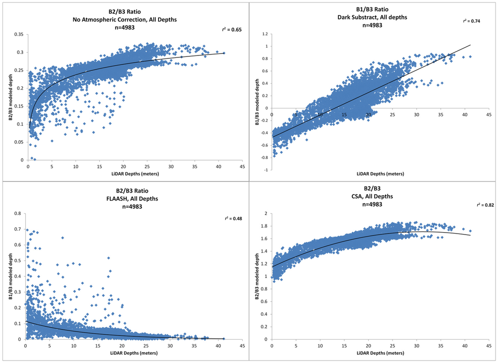 The best overall correlation was by using B2/B3 with the CSA atmospheric correction for the depth range of 0–10 m (r2 = 0.72). The best performance for the image with no atmospheric correction was the band ratio B2/B3 for the 0–10 m depth (r2 = 0.35). For the dark subtract atmospheric correction the band ratio B1/B3 provided the best performance and was for the depth range of 0–10 m (r2 = 0.60). For the atmospheric correction FLAASH, the best performance for WV2 was the band ratio B1/B3 for the 25–35 m depth band (r2 = 0.17).