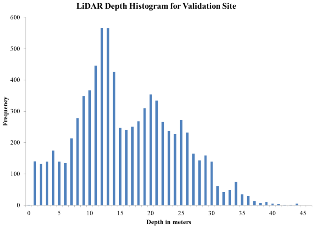 The model from the B2/B3 ratio from CSA with a second order polynomial equation (y = −0.0006x2 + 0.0359x + 1.1498) was applied to another location within the WV2 image (Figure 7) This model was applied to the image and analyzed for accuracy of the model in depth estimation when compared with LiDAR depths. The validation area shows an average depth of 15.7 m with a depth range from 1 to 43 m (Figure 8).