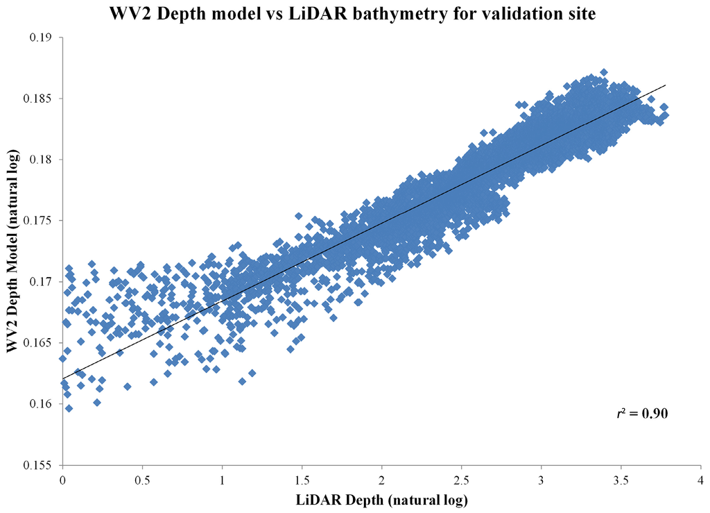 The values collected from WV2 Depth Model and LiDAR bathymetry were log transformed and then plotted to validate the model performance in estimating depth (Figure 9). The coefficient of determination (r2) was 0.90 for all the depth values sampled. The values were also analyzed to determine the model performance by depth range (Table 2).