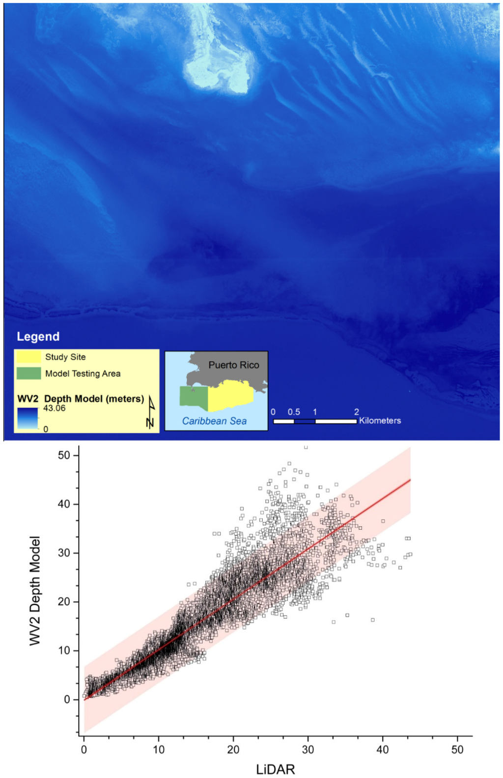 (Top) Depth estimation based on WV2 depth model for validation site within the WV2 image off southwestern Puerto Rico. (Bottom) Depth values (in meters) for WV2 depth model and LiDAR depths with 95% confidence and prediction bands. Note values dispersion after 20-m depth.