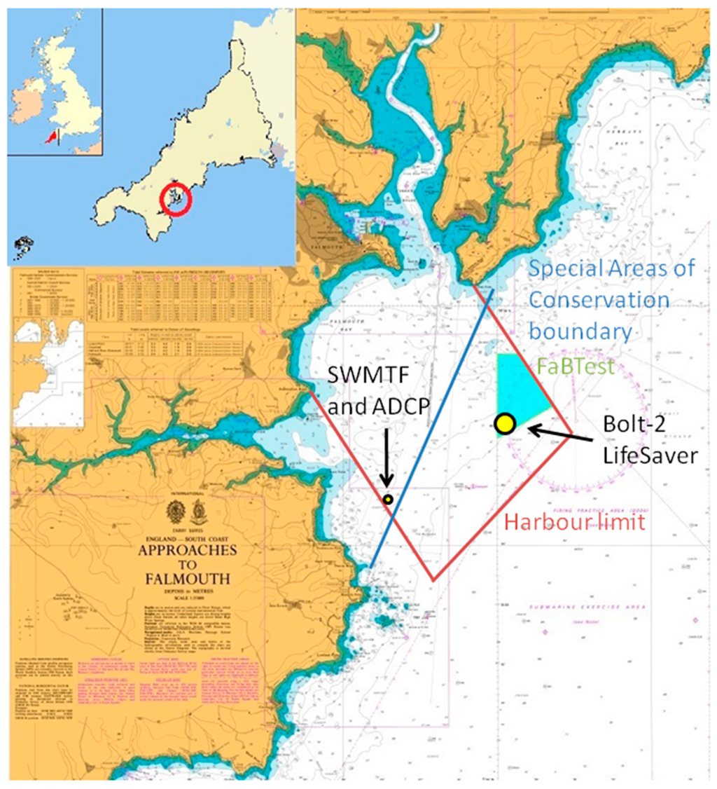 Two facilities were used to gather data for this study: the South West Mooring Test Facility (SWMTF) and the Falmouth Bay Test Site (FaBTest), where the Fred Olsen Bolt-2 Lifesaver wave energy device was installed. These two facilities are located in the southwest of the U.K., less than three nautical miles (~5 km) apart on the South Cornish coast (Figure 1).