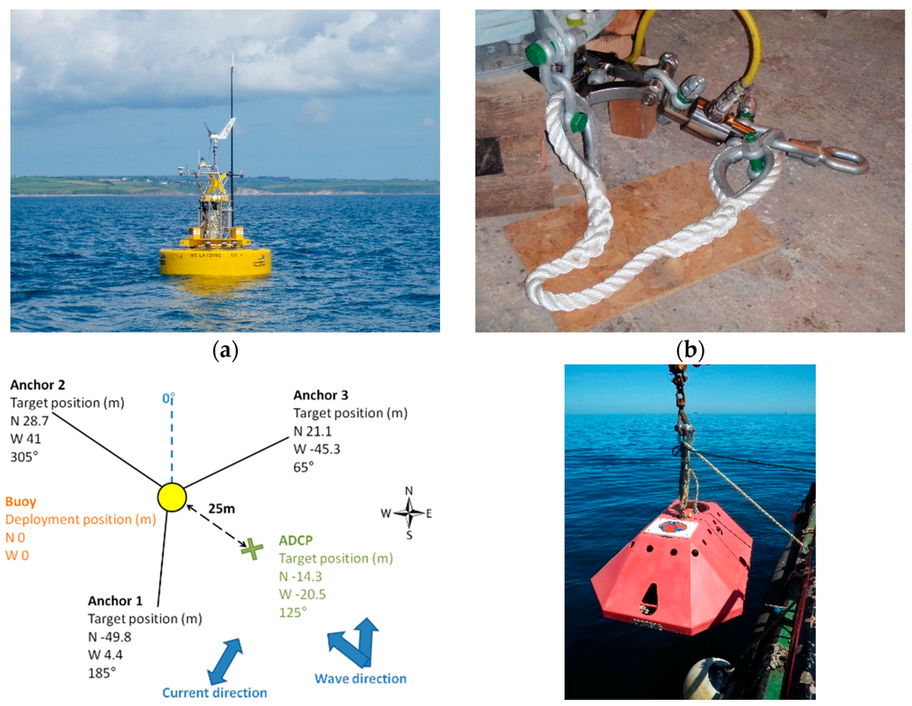 SWMTF arrangement and instrumentation: (a) buoy; (b) tri-axial (left) and axial (right) mooring load cells and back-up rope (white); (c) plan view layout of the mooring system and ADCP (wave and current sensor) and (d) ADCP in its frame being installed.