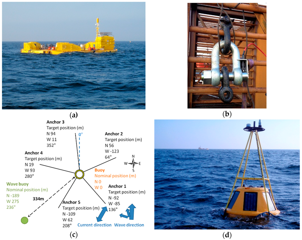 Bolt-2 Lifesaver arrangement and instrumentation: (a) floating structure; (b) mooring load cell; (c) plan view layout of the mooring system and wave buoy; and (d) adjacent wave buoy.