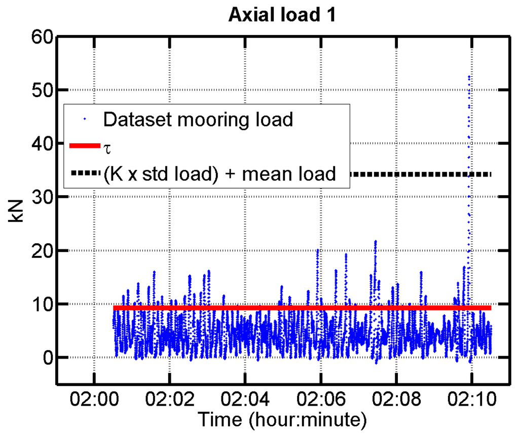 Example of a 10-min record of mooring load on line 1 at SWMTF showing the value during a storm (17 November 2010) and a comparison of the values with a load factor K and a minimum threshold τ.