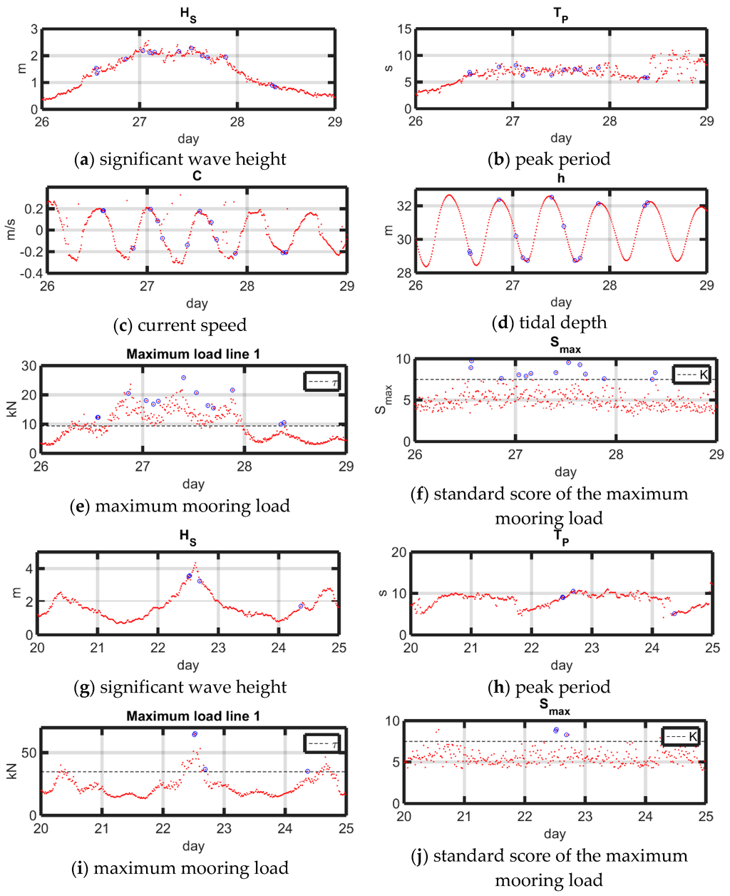 Example of sea trial measurements for several days (red dots) and the detection of peak mooring loads and their corresponding environmental conditions (blue circles): at SWMTF: (a) HS; (b) TP; (c) C; (d) h; (e) maximum mooring load on line 1; and (f) standard score of the maximum mooring load Smax on line 1; at the Bolt-2 Lifesaver installation: (g) HS; (h) TP; (i) maximum mooring load on line 1; and (j) standard score of the maximum mooring load Smax on line 1.