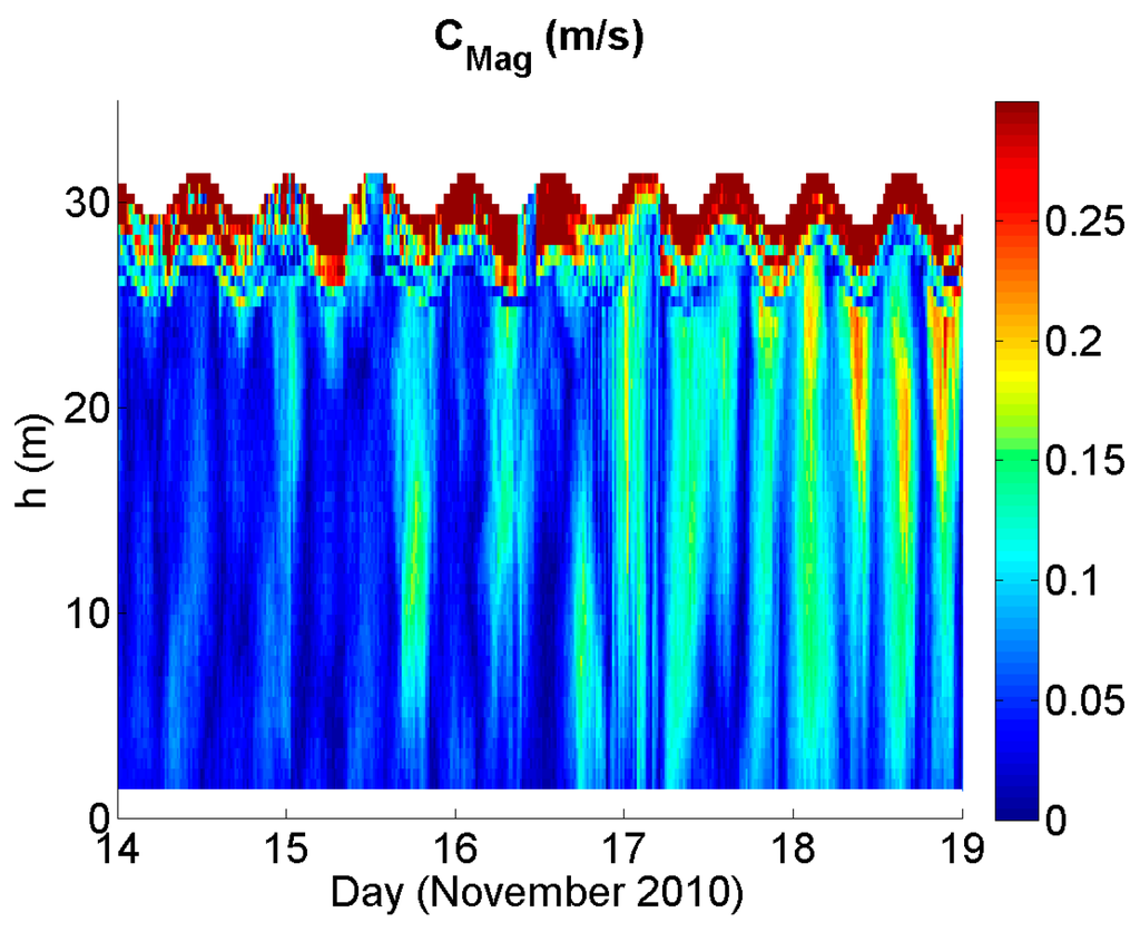Example of current magnitude data recorded by the ADCP at SWMTF through the water column for several days.