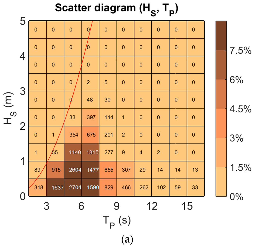 The contour plot of the joint percentage of occurrences of HS and TP is shown in Figure 8a. The interpolated sea states were classified into 41 sea state ranges. The sea states that occurred more than 7.5% of the time during the period of measurement were for HS below 1 m and TP between 4 and 7 s. The maximum measured HS was below 4 m.