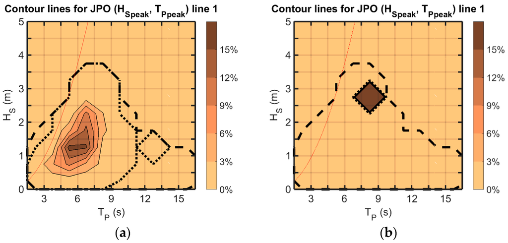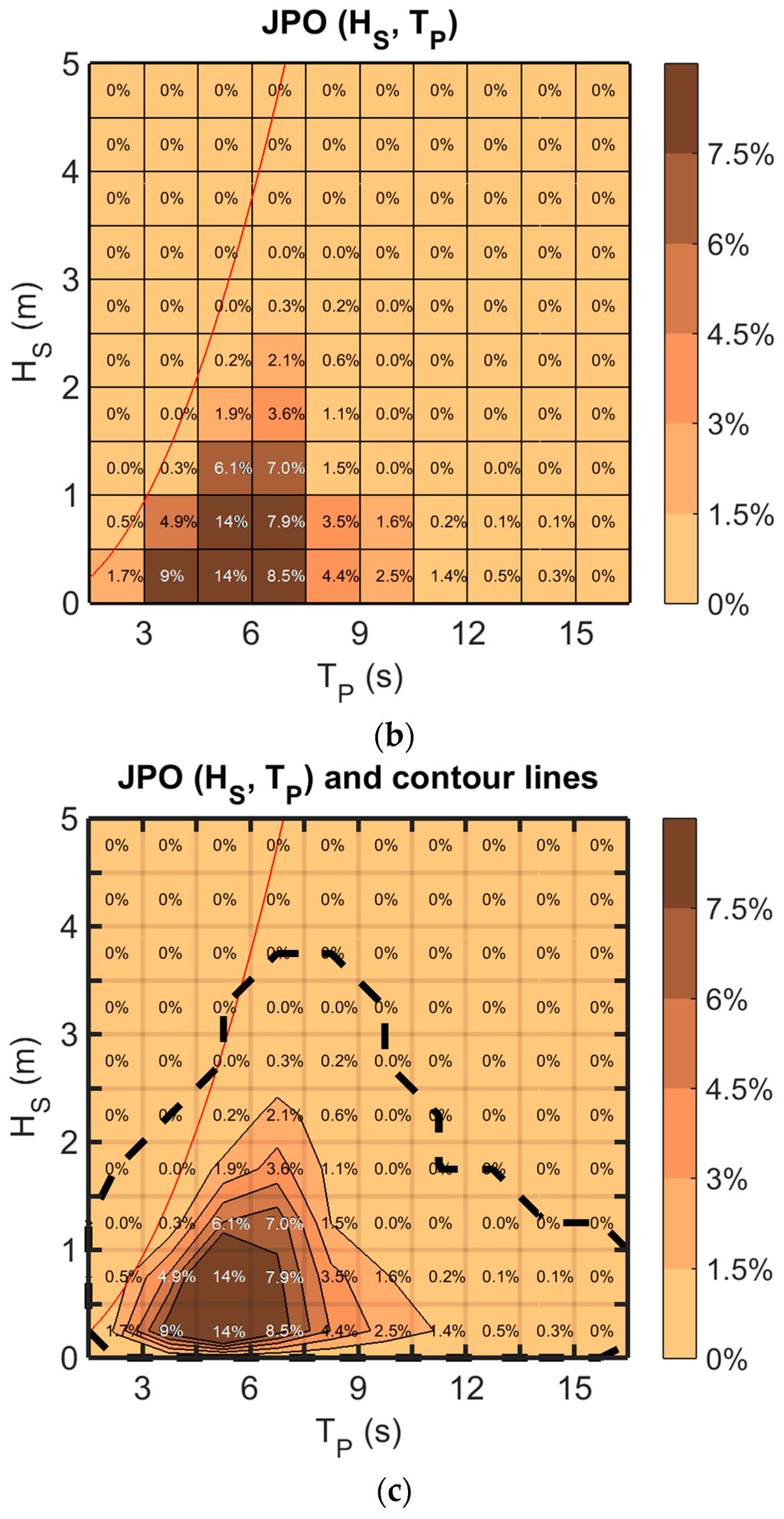 The HS and TP wave measurements are arranged in a 10 × 10 scatter diagram. Figure 7a is an example of such a scatter diagram. The corresponding matrix of JPO is calculated for each HS and TP pair in Figure 7b following Equation (5).