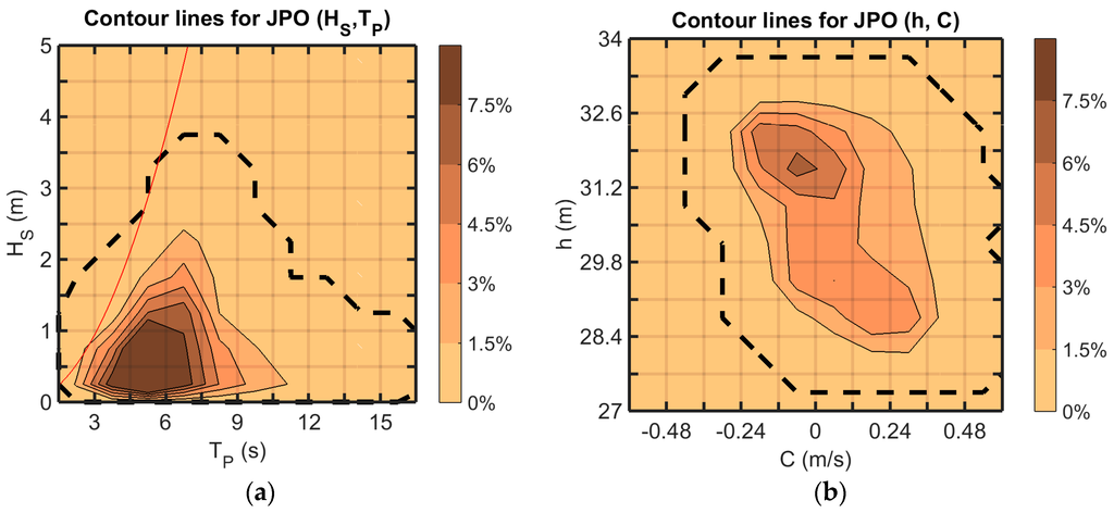 A similar methodology is followed for the calculation of the joint percentage of occurrences of tidal conditions, as shown in Equation (6):