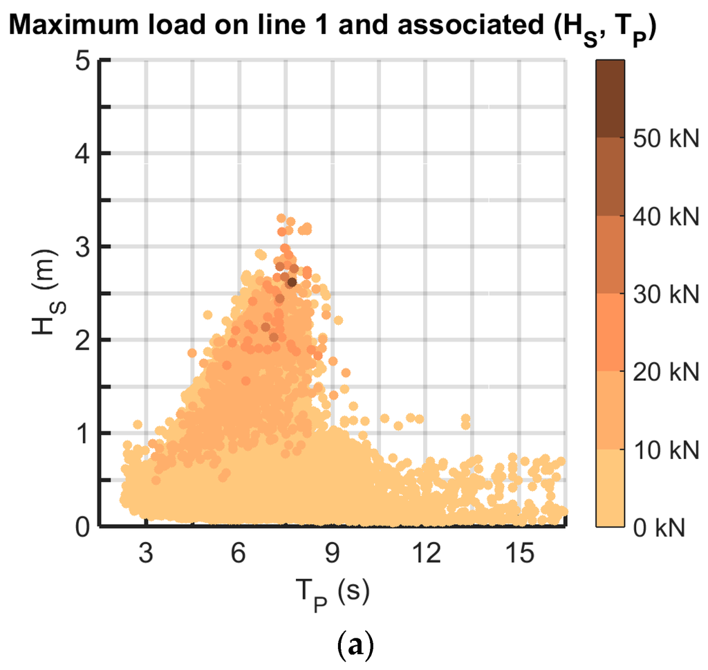 The findings in this paper indicate that specific MEC design procedures would be beneficial. Currently, MEC devices are largely designed following offshore standards, with a tendency for too conservative design assumptions, leading to overdesigned mooring systems []. Design calculations could be conducted inside the scatter diagram, during operations. These calculations are most of the time already conducted for PTO optimisation and survival. MEC mooring systems could also be designed following a load and resistance factor design (LRFD) method [], which is well suited to a given MEC mooring system.
