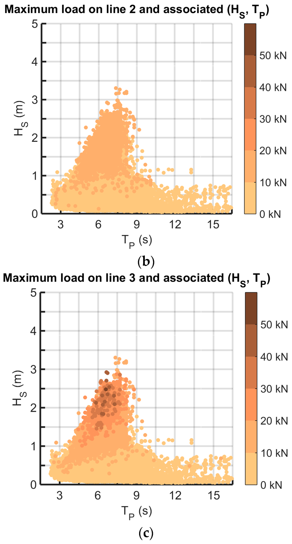 The amplitude of the maximum load recorded on each mooring line, as well as the associated wave conditions are plotted in Figure 9a–c. Figure 9a,c indicates that only one dataset of mooring load on line 1 and line 3, respectively, had a maximum load over 50 kN. This maximum load occurred for two distinct sea states. In both cases, this maximum occurs for HS approximately equal to 2.5 m and TP to 7 s. Figure 9a,c also indicates that there were more datasets with the maximum over 30 kN occurring on mooring line 3 than on mooring line 1. Figure 9b shows that all mooring loads on line 2 were below 20 kN. Figure 9a–c also shows that the maximum mooring loads are generally higher for high HS values.