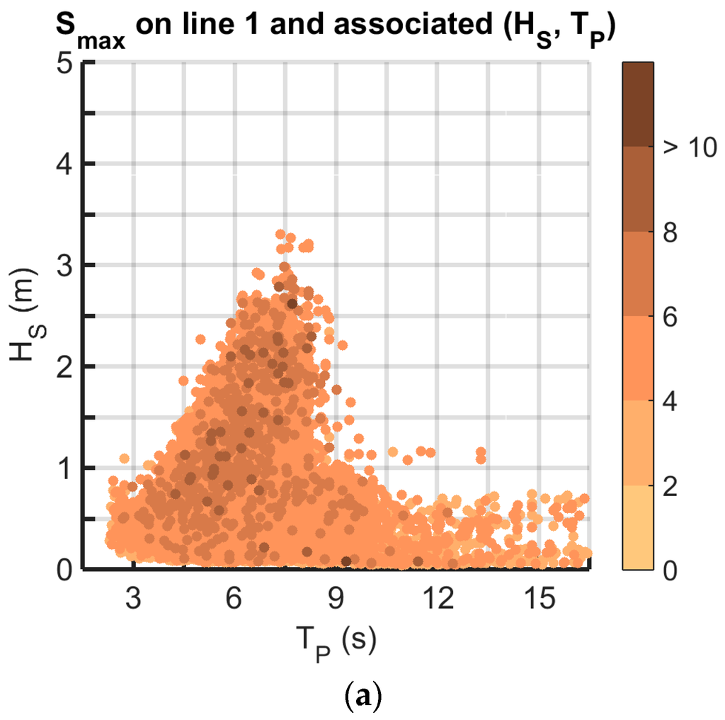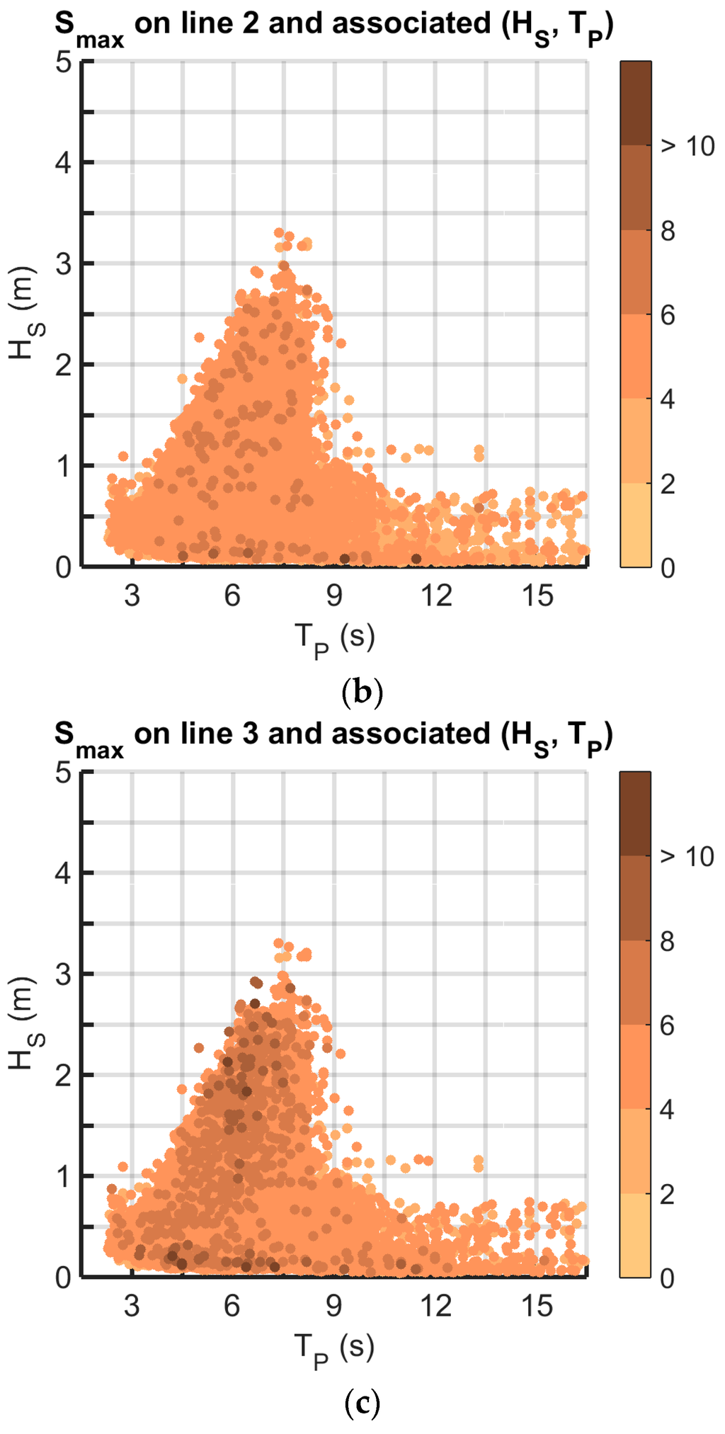 The standard score of the maximum Smax recorded on each mooring line, as well as the associated wave conditions are plotted in Figure 10a–c. These figures indicate that high values of Smax can occur for any sea state. Higher values of Smax are achieved on lines 1 and 3 than on line 2.
