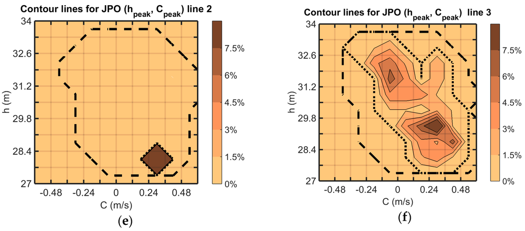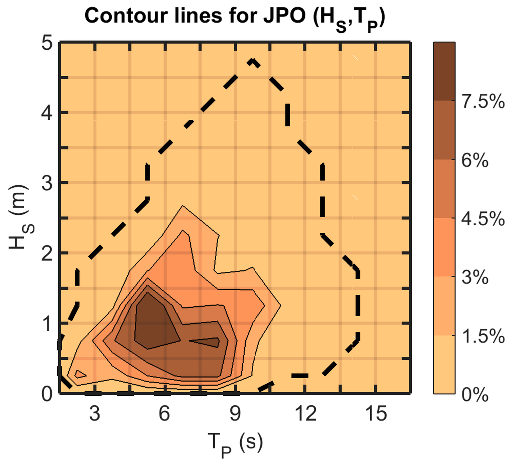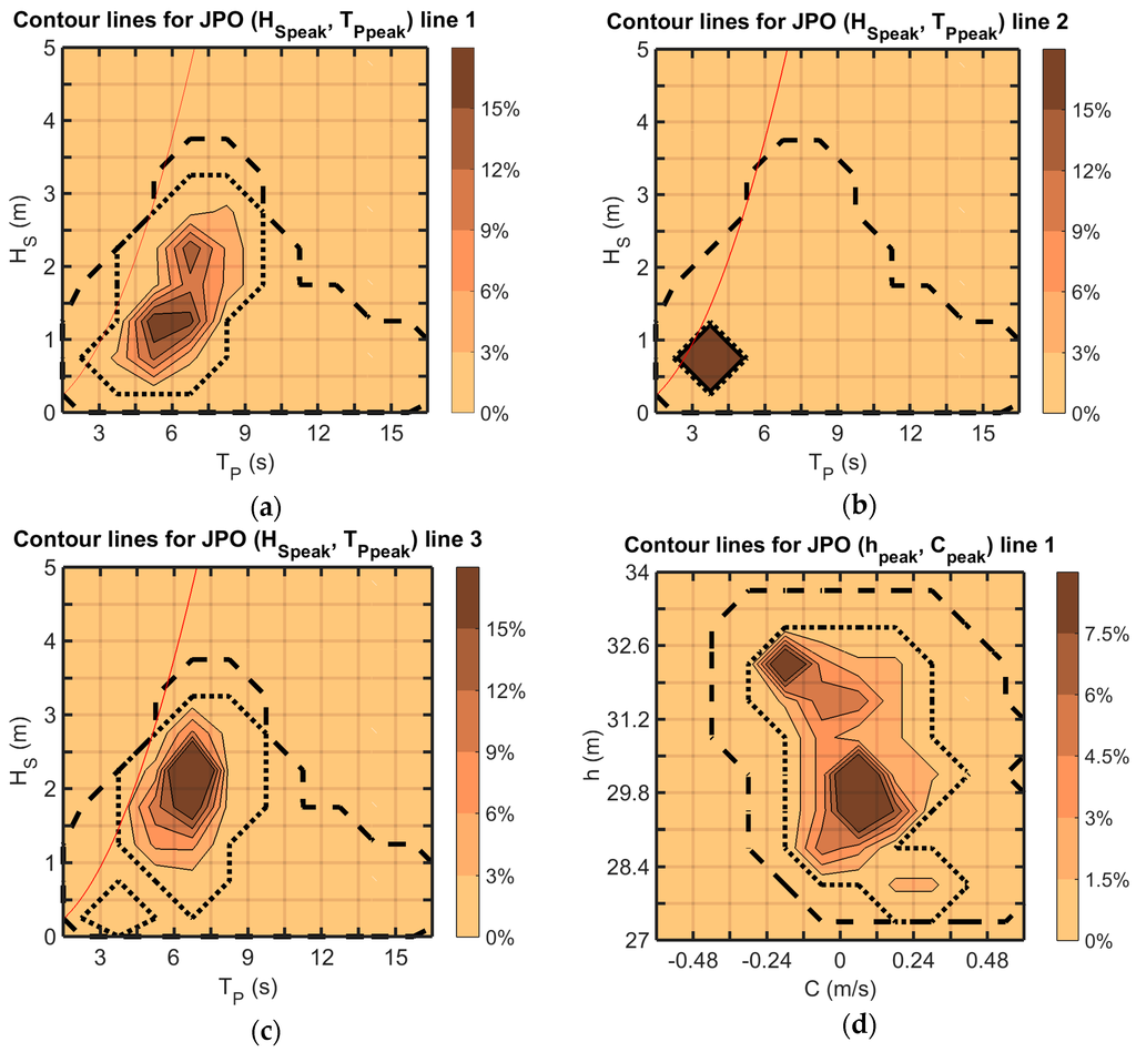 The joint percentages of occurrences of environmental conditions associated with peak mooring loads JPO(HS peak, TP peak) and JPO(Cpeak, hpeak) (if available) are calculated. Multi-contour plots are drawn to summarise these results. These plots indicate which wave or tidal conditions were more frequently associated with peak mooring loads. These JPOs need to be compared to the joint percentages of occurrence of general environmental conditions JPO(HS, TP) and JPO(C, h). For this purpose, the external contour line of the HS and TP JPO plot, which is the line between the observed occurrence and the absence of occurrence of a given sea state, is added to the plot of the joint percentage of occurrence of HS peak and TP peak (black dotted line). A similar line is added to the tidal condition plot.