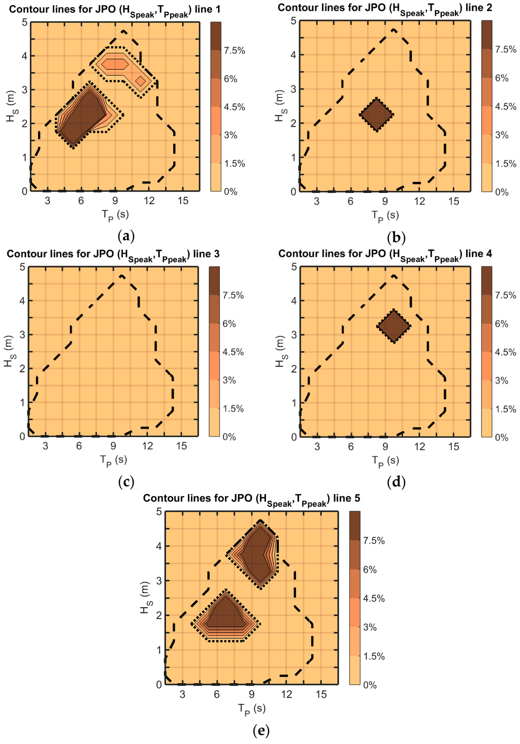 JPO for the Bolt-2 Lifesaver wave conditions associated with peak mooring loads: JPO(HS peak, TP peak) on mooring lines (a) 1, (b) 2, (c) 3, (d) 4 and (e) 5. The large black dashed line is the external contour line of the general environmental conditions. The thin black dotted line is the external contour line of the environmental conditions associated with peak mooring load.