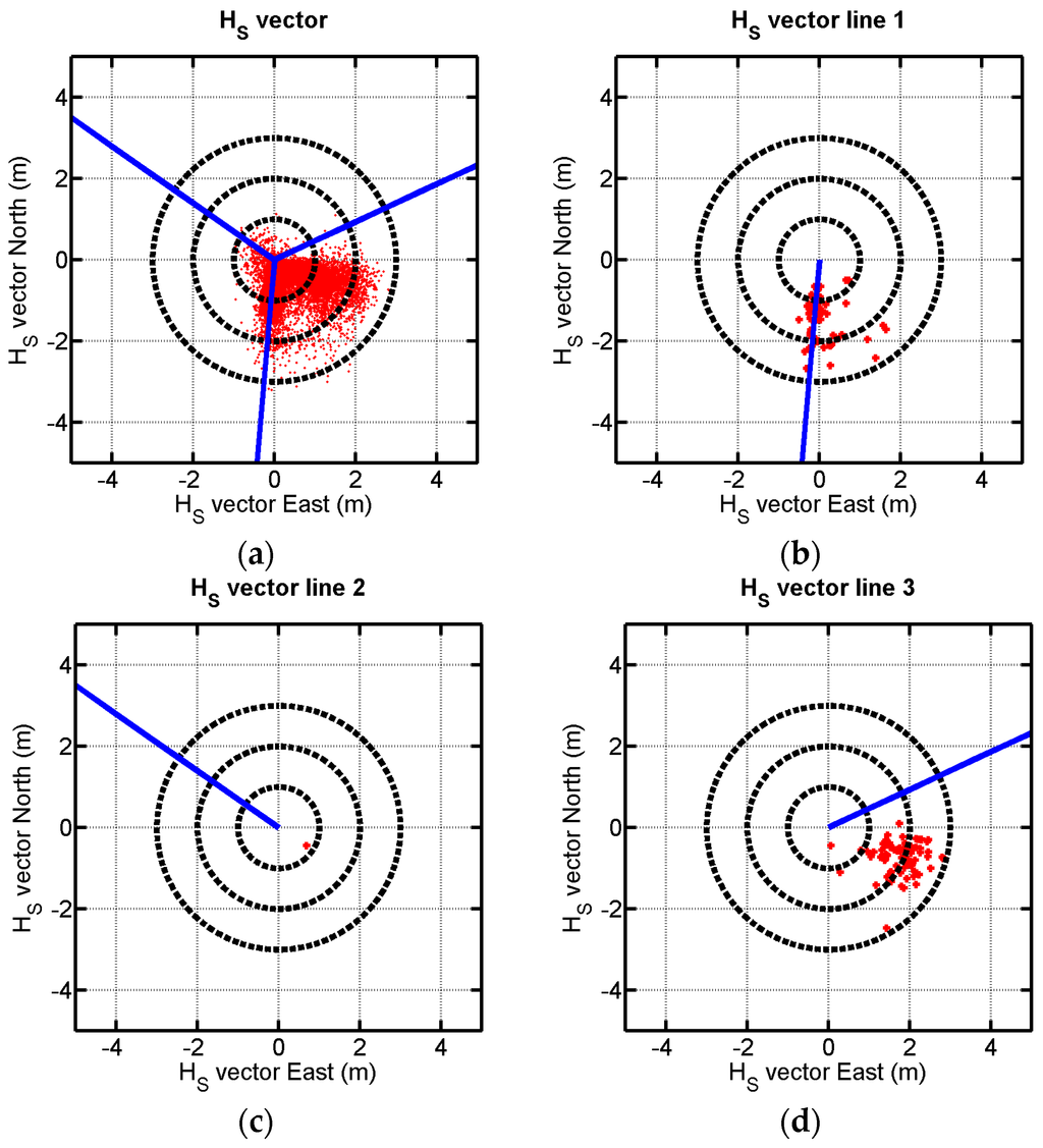 Results indicated that peak mooring loads occurred for a low value of HS if the mooring line was aligned with the wave direction (Table 6). Figure 14a–d plots a vector HS vec (red dots) with an amplitude equal to HS and a direction equal to the peak direction DP, associated with the peak period TP. In Figure 14a, the three mooring lines are drawn (blue lines), while in Figure 14b–d, only one mooring line is drawn. Figure 14a plots HS vec for the general environmental conditions, while Figure 14b–d plots HS vec for the wave conditions associated with peak mooring loads on mooring lines 1–3, respectively. Figure 14a shows that two wave climates are occurring at SWMTF: one with waves coming from the east, the other with waves coming from the south. The mooring configuration of SWMTF was orientated to have the easterly sea states between mooring lines 1 and 3. The consequences of this choice can be observed in Figure 14b–d. Figure 14d indicates that no waves were able to align with line 3, resulting in peak mooring loads mainly for high HS values. In Figure 14b, it can be observed that the waves coming from the south are able to align with line 1, resulting in peak mooring loads, even at low HS, with wave heights below 1 m. These results indicate that directional contours could be introduced for the mooring design of any system installed in a location with different dominating wave directions in order to optimise the mooring configuration accordingly.
