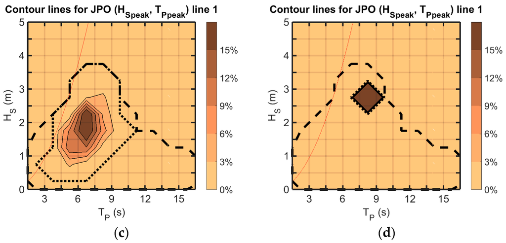 The usage of multiple contour lines allows the separation of environmental condition by percentage of occurrences. For example, a point in Figure 7c between a 3% and 6% curve means that between 3% and 6% of the recorded wave conditions were occurring in this range of occurrences of the HS and TP values. These contour lines should not be confused with the x-year return period contour lines as defined by the Det Norske Veritas standard DNV-OS-E301 []. The contour lines defined in this paper and used in the following are based on measurements and show sea states that occurred a similar number of times during a sea trial, while contour lines used for the mooring design are based on probability models and show points with the same probability of occurrence.