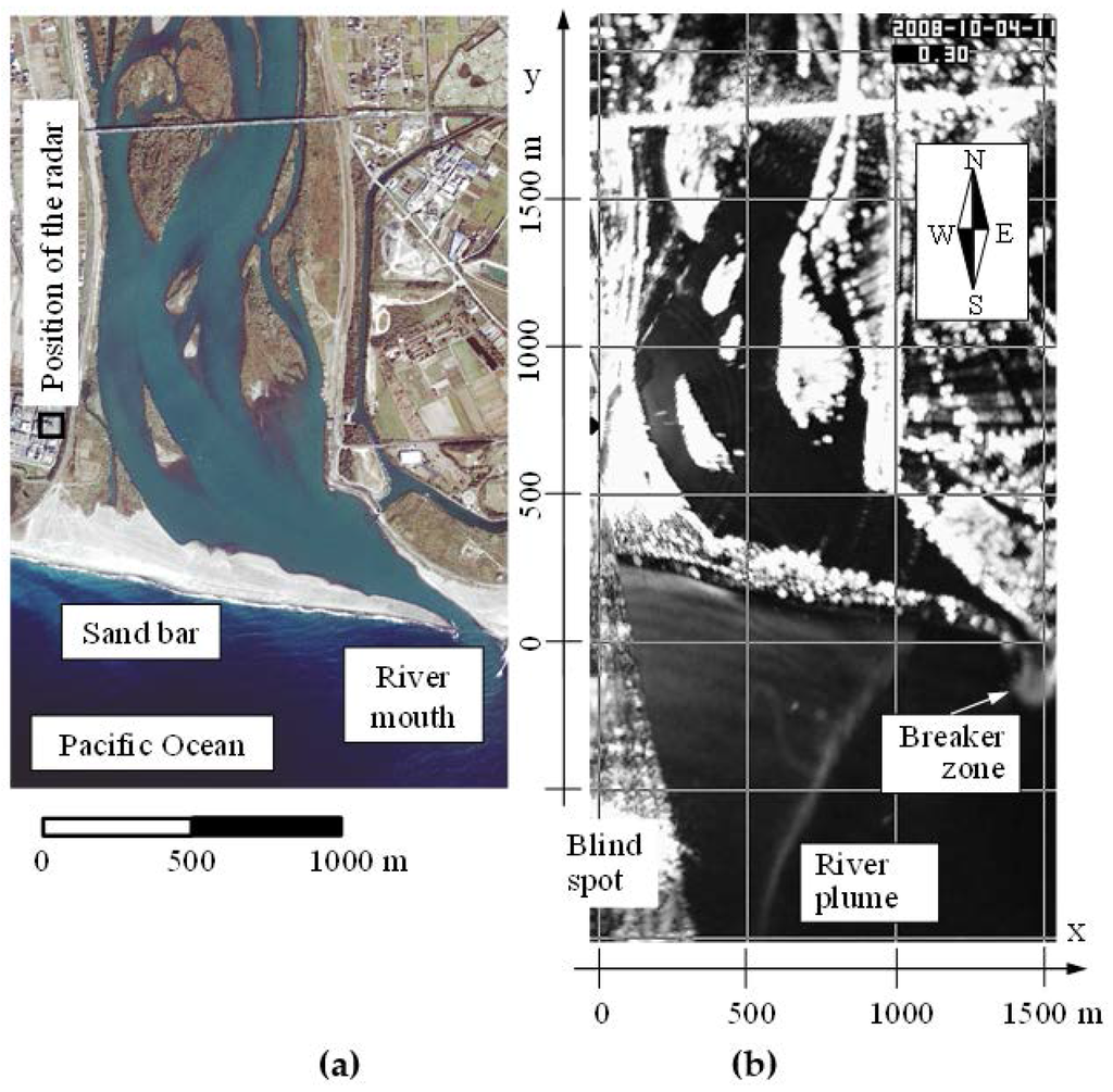 Recently, Holman and Haller discussed the various aspects of the different disciplines of nearshore remote sensing in a review article [4]. They compared merits and characteristics of active and passive remote sensors (cameras, radars, lidars, etc.) and platforms (fixed, flying, floating, and orbiting), and concluded that for nearshore oceanographic applications, fixed optical cameras and X-band radars are the most frequently used and best developed. This study demonstrates the potential of land-based X-band radar observation in a drastic developing flood event at a river mouth in Japan.
