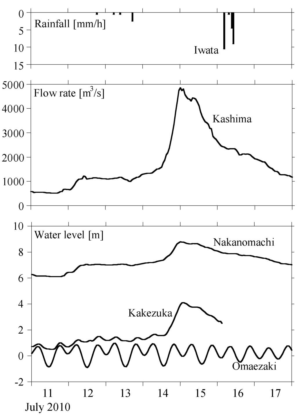 A Baiu front was active from 10 to 16 July 2010 along the Japanese main island Honshu and delivered heavy rain in the catchment of the River Tenryu. Figure 2 shows the variations of river water levels, tide level, flow rate and rainfall. River water levels in Tokyo Peil (T.P.) were measured at the Kakezuka station, 4 km from the river mouth in the tidal range, and the Nakanomachi station, 9 km from the river mouth, and the river flow rate was estimated at the Kashima station, 25 km from the river mouth. The water level record is missing from 16 h (JST) on 16 July 2010 at the Kakezuka station. The ocean sea level was measured at the Omaezaki tide station, 40 km to the east of the river mouth. The largest delay of the tidal propagation from the tide station to the river mouth was estimated approximately 5 min from the records of neighboring tide stations. The rainfall was measured at the Iwata weather observatory, 9 km to the north east of the river mouth.