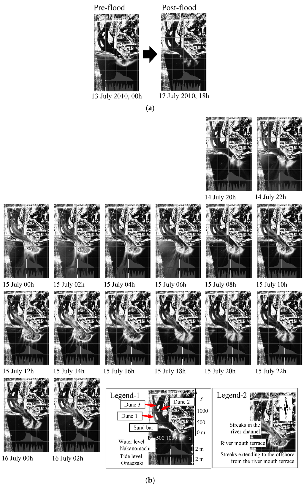 (a) Time-averaged images during the flood. Pre-flood: 13 July 2010, 00 h JST. Post-flood: 17 July 2010, 23 h JST. The lower portion of each image shows the water level variations measured at the Nakanomachi station in the river and the Omaezaki tide level station. The white vertical line in this lower portion denotes the temporal position in the radar acquisition; (b) Time-averaged images during the flood. From 14 July 2010, 20 h to 16 July 2010, 02 h.