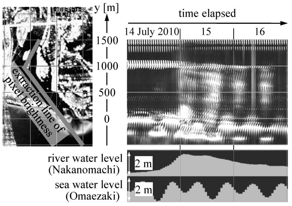 Figure 5 shows a time-averaged image on the left and a time stack image on the right. To obtain the time stack image, which has spatial extent in the vertical and temporal extent in the lateral, pixel intensities along the oblique grey bands shown in the time-averaged image, whose width in the lateral or east-west direction is 15 pixels or 81 m, were extracted and stacked in the vertical at specific times. This extraction was repeated for the following time-averaged images and stacking positions shifted in the lateral. In the lower right below the time stack image, the river water level variation measured at Nakanomachi and the tide level at Omaezaki are also shown.