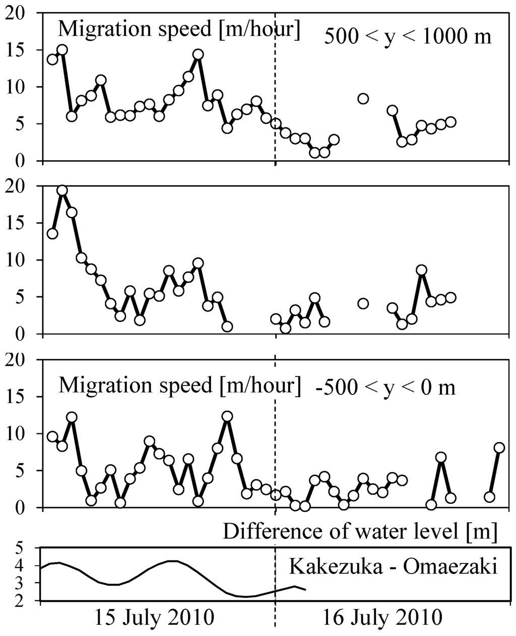 Estimated migration speeds of the light-dark pattern were of the order of 10 m/h (~0.003 m/s) and varied in accordance with the water level gradient, which supports our speculation, or the proxy hypothesis, that light-dark patterns can be regarded as proxies of river bed variation during the flood.