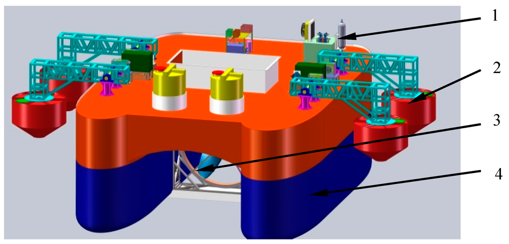 Schematic of floating platform of offshore ocean energy converter. 1. Hydraulic energy storage and generation parts; 2. Floating buoy and link parts; 3. Current energy capture part; 4. Movable catamaran platform.