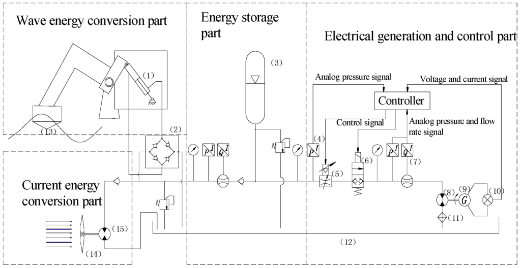 The schematic of the FOECD consists of the following main sub-system loops: wave energy capture, current energy capture, hydraulic energy storage, electrical generation and control, as shown in Figure 2. The wave energy capture part includes oscillation buoys (13) and piston pumps (1) to convert mechanical energy into hydraulic energy. Four check valves are used to establish a hydraulic bridge circuit (2), which is used to convert the two opposite hydraulic oil flows into a single direction supply. The current energy capture part includes three turbine blades (14), the speeder and the rotor pump (15), and the turbine blades are assembled on the horizontal shaft. The hydraulic energy storage part mainly consists of the accumulator (3), the unloading circuit, the pressure instruments and flow meter sensors. The electrical generation part consists of the hydraulic motor and electrical generator, and the control part includes the pressure sensor, the flow meter and the proportional flow control valve, which is used to regulate the pressure drop and the flow rate of the hydraulic oil through the motor. Some main scales and characters of FOECD are as follows: