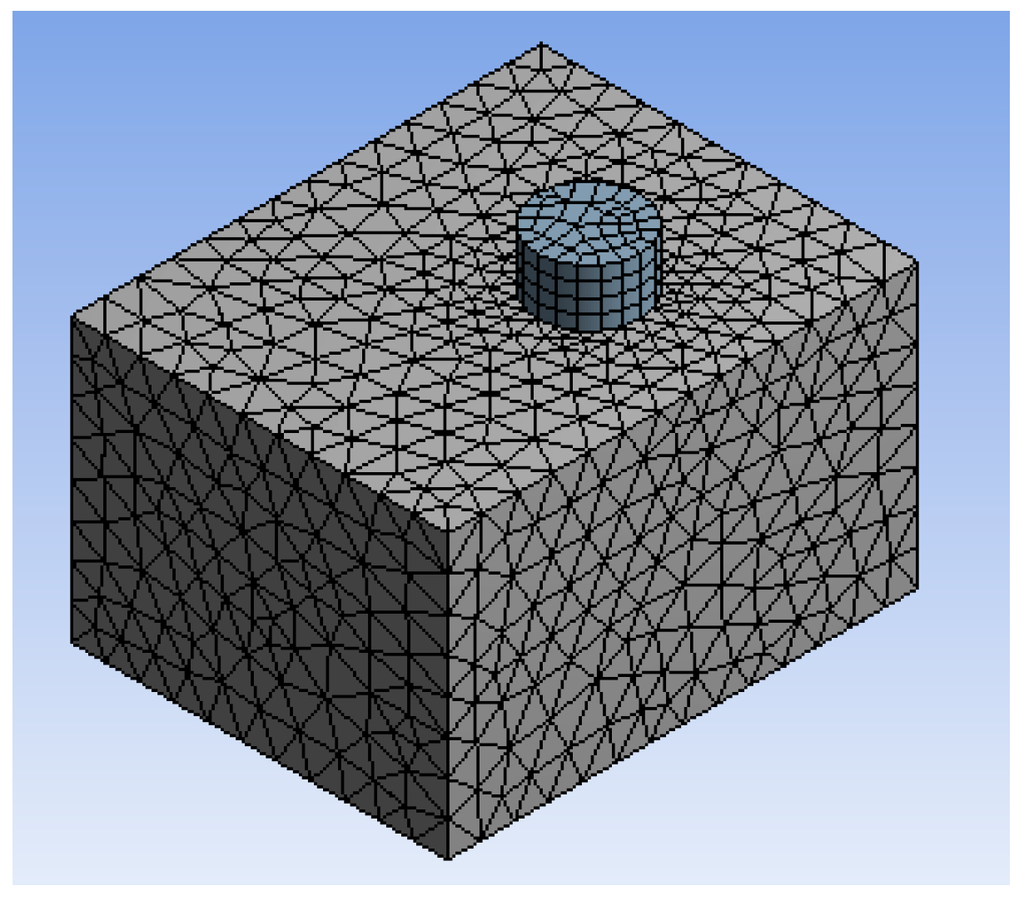 The Navier-Stokes (N-S) equation and the Froude-Krylov (F-K) theory were selected in the simulation model [21], and the Semi-Implicit Method for Pressure-Linked Equations (SIMPLE) method is selected in the calculation. The aim of the simulation was to calculate the maximum stress, deformation and strain of the buoy. A single-direction fluid-solid coupling analysis model was used with an ANSYS workbench software tool, and the fluid coupling field was 10 m × 8 m × 6 m (shown in Figure 3). To calculate the fluid pressure and velocity assigned to the fluid field, the pressure applied on the buoy surface is initially found, and then the stress and strain of the buoy are calculated under the impact of the wave. Due to viscous damping having an apparent influence on the wave impact coefficient acting on the buoy, the N-S equation and F-K theory were selected in the simulation model. In the N-S calculation, the SIMPLE method was selected, which is suitable for solving unstable turbulence fields. Some assumptions and simplifications were made as follows: