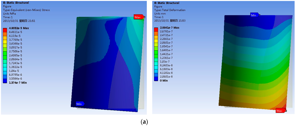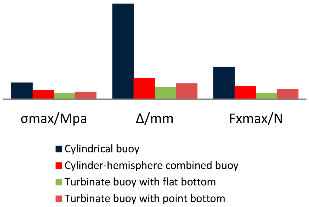 To ensure the safety of the floating platform, it is necessary to analyze the suitability of the floating buoy. The maximum Von Mises stress and deformation is calculated for the wave acting on the buoy in the horizontal direction to judge the suitability of the small floating buoys. In the condition of the same wave period, wave amplitude and wave length, a lower stress means better suitability. Similarly, the maximum stress and deformation when waves act on the buoy in the vertical direction relate to the power harvesting performance of the buoy, and a larger stress gives a better power harvesting performance. In the simulation model, the radius of the cylinder part is fixed as 1.1 m and the total height is 3 m for the turbinate buoy. Simulation models were established for four types of buoys including a cylindrical buoy, a turbinate buoy with a point bottom, a turbinate buoy with a flat bottom and a cylinder-hemisphere combined buoy.
