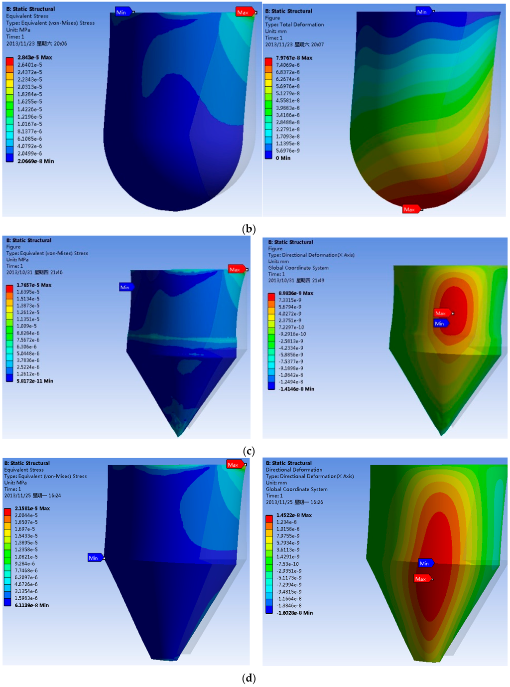 Von Mises stress and deformation of four types of buoys. (a) cylindrical buoy; (b) cylinder-hemisphere combined buoy; (c) turbinate buoy with point tip; (d) turbinate buoy with tip radius at 0.2 m.
