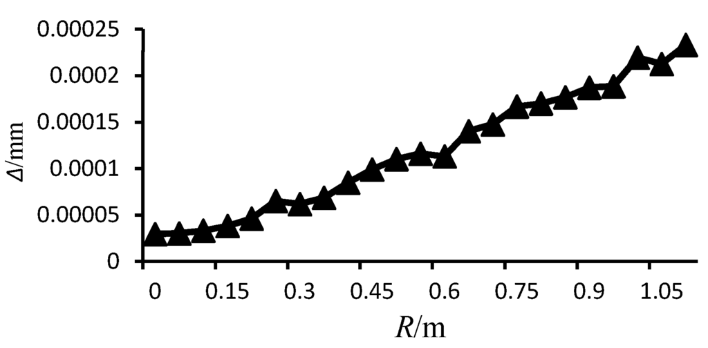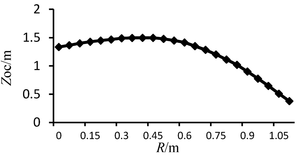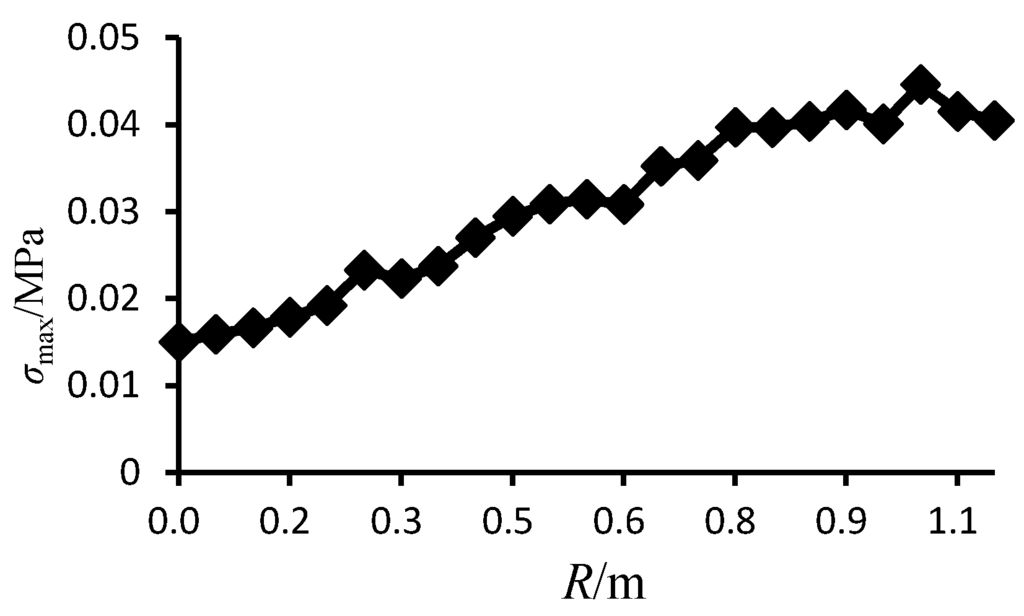 Figure 5 shows the comparisons of the Von Mises stress (), total deformation () and maximum impact force acting on the buoys in the horizontal direction () for each of the four buoy types. In the figure, the two turbinate buoys have the lowest Von Mises stress, deformation and impact force, with values 20%–80% less than those of the cylindrical buoy and cylinder-hemisphere combined buoy. It illustrates that the turbinate buoy has the best suitability. To optimize the turbinate buoy, the tip radius of the circular cone is adjusted from 0 m to 1.1 m with a span of 0.05 m. Through the same simulation method, the curves of , and are shown in Figure 6, Figure 7 and Figure 8, respectively.