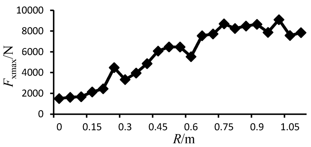 In the three figures, , and increase with the increasing tip radius of the circular cone, but the trends are not entirely consistent. When the tip radius of the cone increases from 0 to 0.75 m, , and generally increase linearly. When the tip radius increases from 0.75 m to 1.1 m, continually increases while and remain stable. The main reason is because the decrease of the tip radius of the cone causes the taper of the circular cone to increase. This leads the component force in the vertical direction to increase while the horizontal component force has no apparent changes.