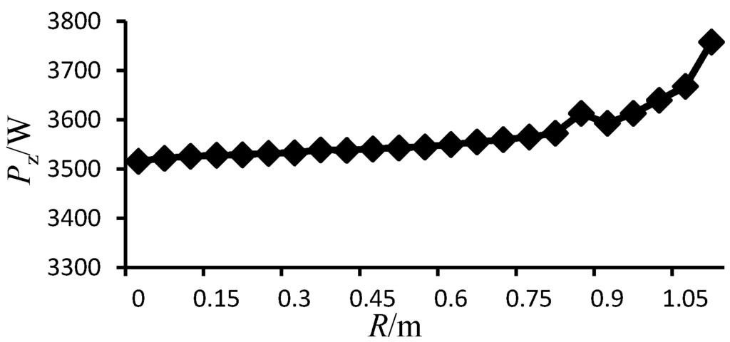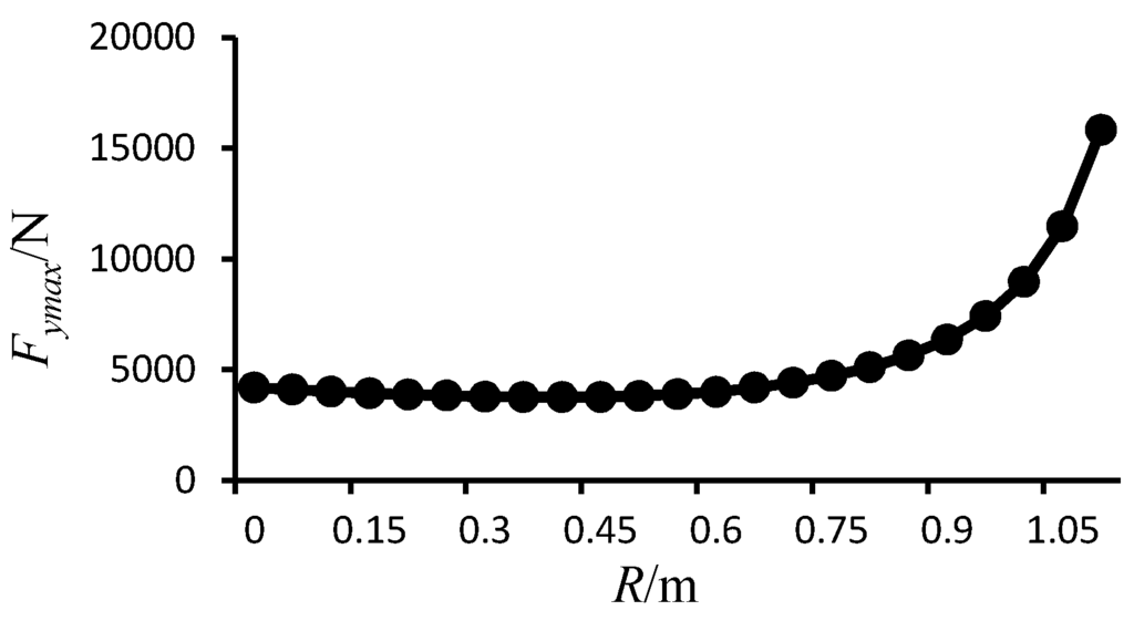 In the theoretical power harvesting model, i.e., Equations (8) and (9), it is clear that the relative oscillation amplitude of the floating buoy is proportional to the wave force (), and the average captured power is mainly determined by both the relative oscillation amplitude of the floating buoy and the wave force. While the taper of the circular cone has an apparent influence on the wave force and oscillation amplitude of the buoy, an analysis of the Von Mises stress, deformation and force in the vertical direction is needed for the small floating buoy. In the simulation model, the flow velocity is 2 m/s and the direction is from the bottom to top of the fluid field. The tip radius of the circular cone is adjusted from 0 m to 1.1 m with a span of 0.05 m. The same simulation method is adopted in the analysis of the stress, deformation and total force in the vertical direction of the turbinate buoy. Figure 9 shows the maximum force curve acting on the buoy in the vertical direction with the varying tip radius of the circular cone. The figure reveals that by increasing the tip radius of the circular cone from 0 m to 0.75 m, the maximum force remains stable. A further increase of the tip radius from 0.75 m to 1.1 m causes the maximum force to increase exponentially.