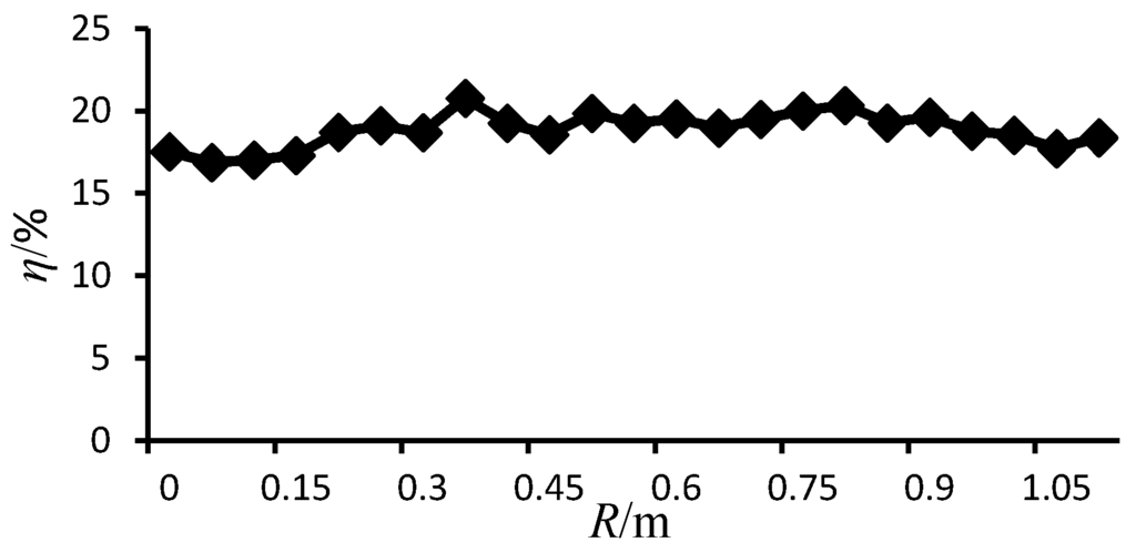 All the certain parameter values were substituted into Equation (8) and the relative oscillating amplitude of the floating buoy was found. Figure 10 shows the curve of the relative oscillating amplitude through the varying tip radius of the circular cone. In the figure, when the tip radius of the circular cone increases from 0 m to 0.4 m, the relative oscillating amplitude remains stable within a certain range; when the tip radius increases from 0.4 m to 1.1 m, the relative oscillating amplitude decreases continually. Furthermore, the average harvest power and the efficiency of the turbinate buoy were found by substituting certain parameter values into Equations (9) and (11), which are shown in Figure 11 and Figure 12, correspondingly. In Figure 12, the average harvest power of the buoy has no obvious change when the tip radius of the circular cone increases from 0 m to 1.1 m, and the harvest power only rises from 3.5 kW to 3.7 kW. It reveals that the shape and scale of the circular cone for the buoy has no apparent influence on the power harvesting capabilities. In Figure 12, the power harvest efficiency is kept at a stable range (17%–20%), which means the tip radius of the circular cone has no apparent influence on the power harvesting capabilities as well.