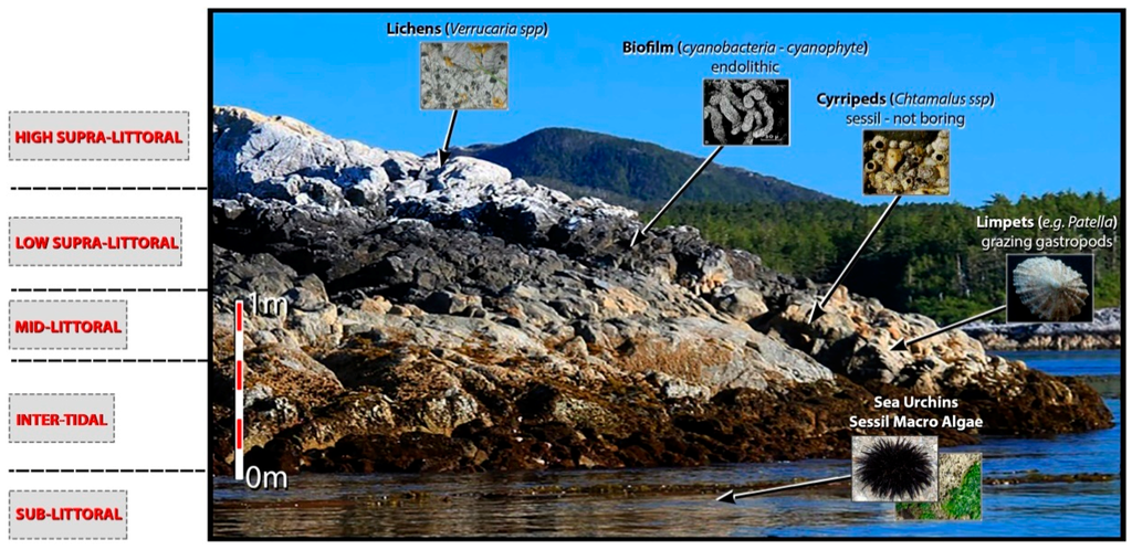 Since the term “bioerosion” was introduced by Neumann [1] for the coastal environment, the contribution of biota to the weathering processes affecting coastal rocks has been evaluated by many authors. The papers of Schneider [2], Trudgill [4], and Torunski [3] still represent the classical reference studies and constitute the fundamentals for any bio-process approach to geomorphological studies of rocky coasts, although limited to limestone shores. These works assess the concept of biological zoning of rocky shorelines, i.e., the distribution of groups of biota in horizontal bands, scaled with respect to elevation from sea level (Figure 1). Sea level being, as a matter of fact, a virtual concept, as its elevation with respect to an extraterrestrial reference system is permanently fluctuating in space and time [15], we refer in this work to “mean sea level”, i.e., the reference ordnance datum of the official Italian Elevation Network. Biological zoning implies a cross-shore variation in the rate of erosion due to biota, which is determined by strictly ecological factors [16,17,18].