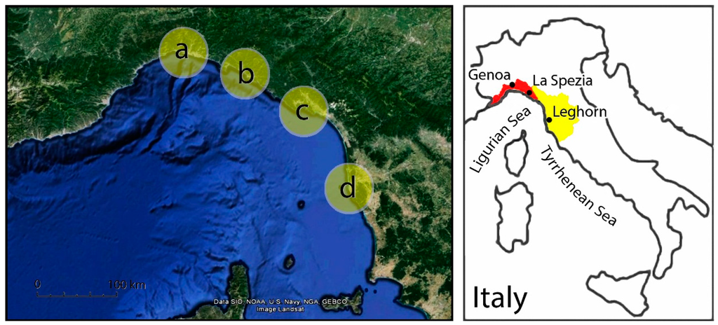 Location and main features of the study sites: (a) Pontetto (silicic flysch); (b) Lavagna (calcareous flysch); (c) Tellaro (carbonates); (d) Calafuria (sandstone).