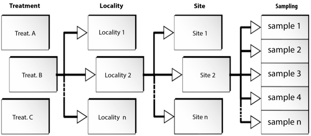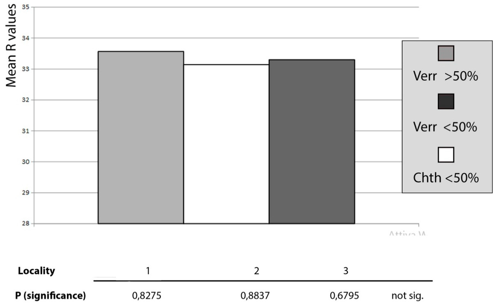 In order to investigate the source of variability of the R value, the ANOVA statistic test was applied for the three localities. Within each locality the replicates were subdivided into three sites, based on spatial contiguity. The experimental design (Figure 3) adopted in this work employs three factors: the fixed factor “treatment” represented by two levels (>50% and<50%) and the two random factors “locality” and “site.” The response of this text shows a probability value which is highly significant for the “site” factor. This demonstrates that the variability between sites of the same locality is great; thus, a remarkable variability exists within each site. These results prevent the possibility of drawing conclusions about the differences between treatments (>50% and <50%) as well as between localities.