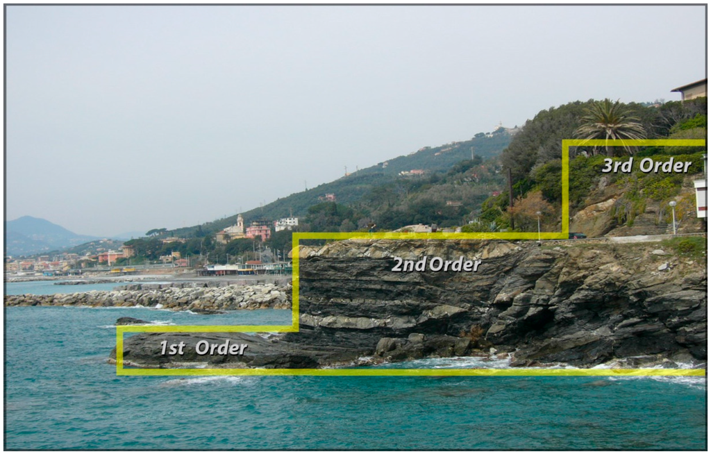 Staircase formed by different shore platform orders (i.e., different elevation), Eastern Liguria-Villa Baldini locality.