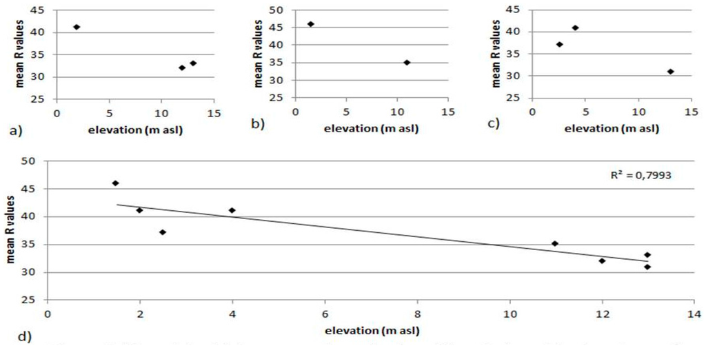 Mean Schmidt hammer rebound values (R) variation with elevation a.s.l. for localities considered in Section 4.1: (a) Castello Cirlo; (b) Villa Baldini; (c) Villa Beatrice; (d) a cumulative plot of the three localities together.