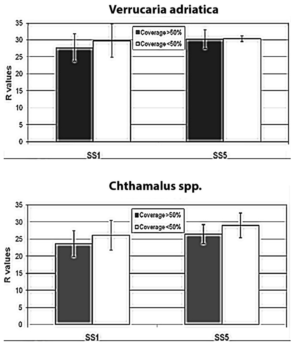 Results show (Table 2, Figure 7) that at both sites mean R values are slightly lower where the barnacle cover is higher (>50%), meaning that the presence of Chthamalus spp. could negatively influence rock hardness. When compared with t-tests (Table 2), only data relative to SS1 provide significant results. At the SS5 site, differences in rock hardness between covered and uncovered quadrats do not show statistically significant results. This could be attributed to the lower number of replicate quadrats screened at SS5 than at SS1. The pattern observed at SS1 for Verrucaria adriatica resembles the one recorded for Chthamalus spp.: R values are lower where the lichen percentage cover is higher, meaning that its presence could weaken rock hardness. However, at SS5 no pattern is evident. In addition, the t-tests do not highlight significant results at any site, meaning that differences observed at SS1 could be due to mere chance.