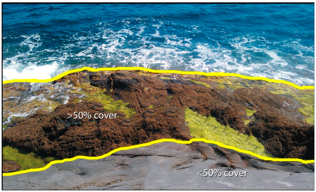 Biological community bands on a typical Mediterranean rocky shore (with a tidal range of 0.4–1 m).