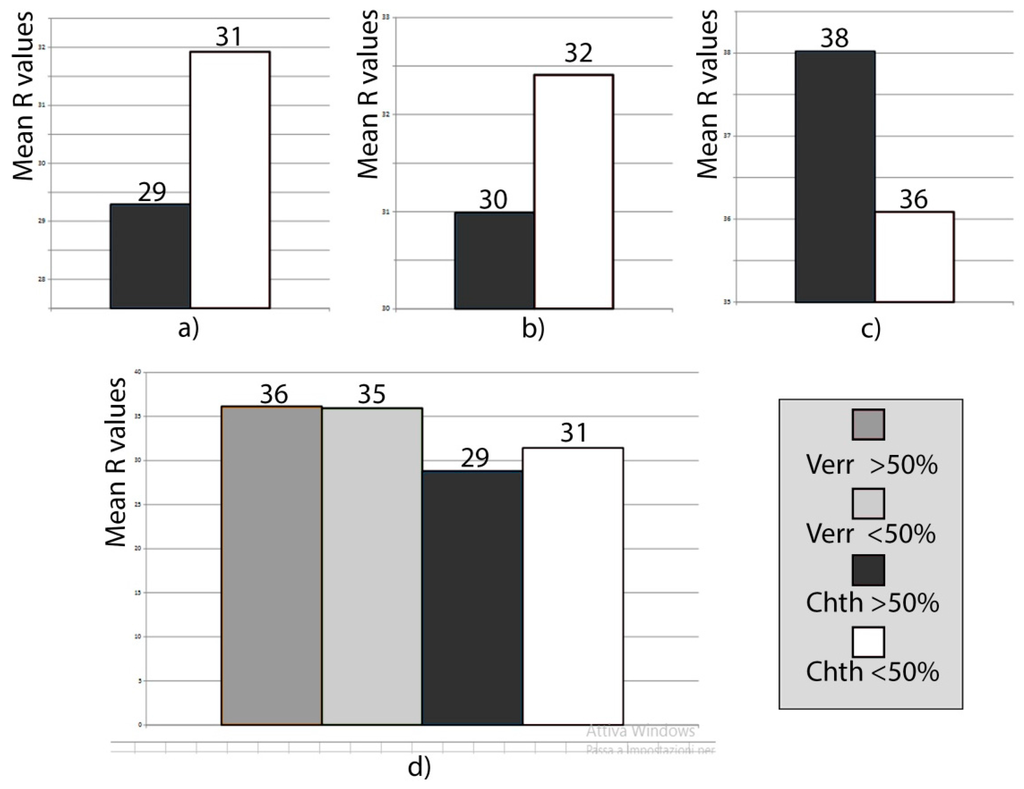 Rebound (R) values related to Chthamalus spp. covers on different localities. (a) Tellaro locality; (b) Pontetto locality; (c) Lavagna locality; and (d) comparison between Verrucaria and Chthamalus spp. in Tellaro locality.